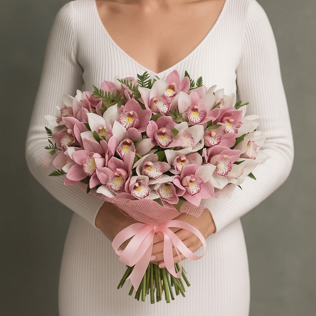 Изысканный круглый букет в пудрово-розовой гамме, где розовые и белые орхидеи цимбидиум создают объёмную фактуру и тонкий аромат. Нежная зелень подчёркивает благородные формы цветков, а аккуратная розовая упаковка и лента придают композиции завершённый, праздничный вид. Идеальный выбор для признания в чувствах, дня рождения, годовщины или как комплимент утончённой особе.